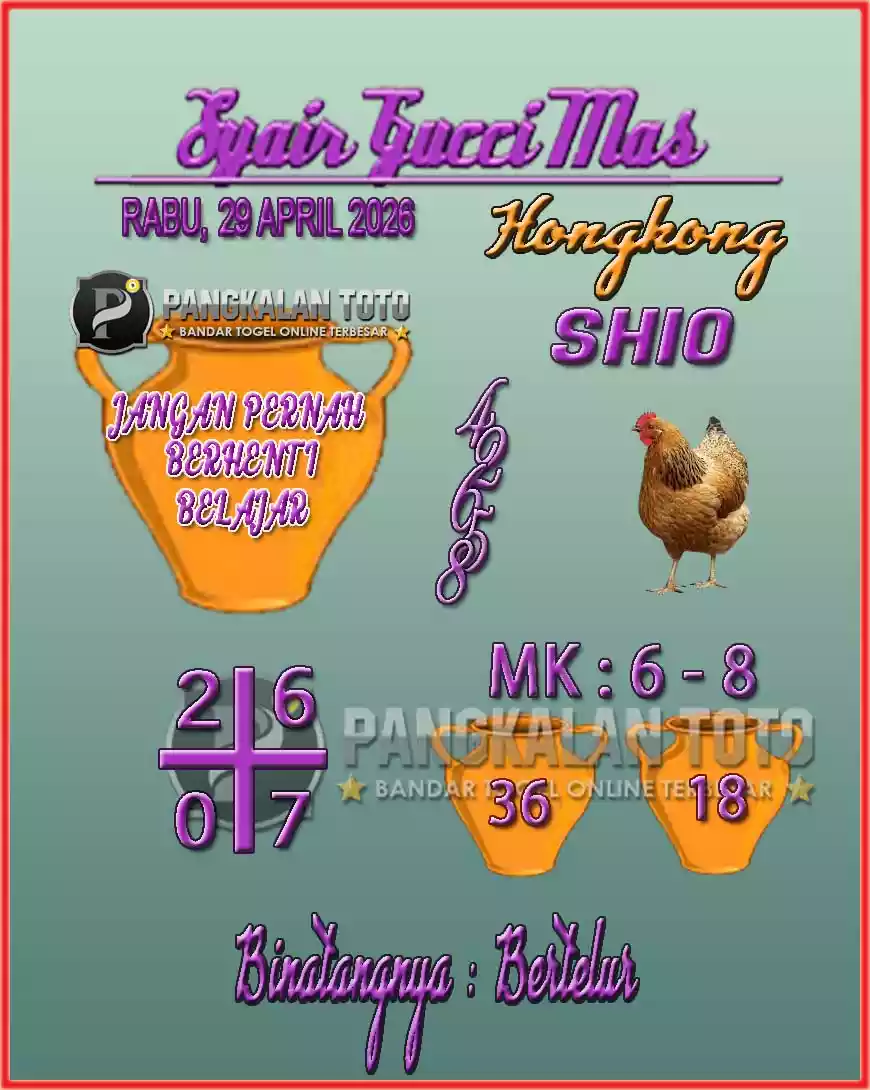 Syair togel hongkong memang kerap terkait dengan angka keluaran hongkong yang hendak muncul di masa nanti. Dalam Berkenaan ini beberapa baik dapat memaksudkan dan mengartikan syair togel online hk itu akhirnya bisa memperoleh angka yang pas di masing-masing kali penempatan taruhan judi di Bandar Togel Online JOGJATOTO. Punyai beberapa keuntungan yang bagus sekali berkaitan dengan penempatan taruhan togel dengan sistem online. Dengan penempatan sama sesuai perhitungan sampai akan mendapati berkali-kali kemenangan. Silakan gunakan syair togel hk ini untuk mendapati angka tepat untuk meraih kemenangan besar.
